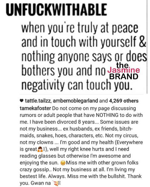 Do not come on my page discussing rumors or adult people that have NOTHING to do with me. I have been divorced 8 years… Some issues are not my business… ex husbands, ex friends, bitch-maids, snakes, hoes, characters, etc. Not my circus, not my clowns … I’m good and my health (Everywhere is great??), well my right knee hurts and I need reading glasses but otherwise I’m awesome and enjoying the sun. ?Miss me with other grown folks crazy gossip.. Not my business at all. I’m living my bestest life. Always. Miss me with the bullshit. Thank you. Gwan na