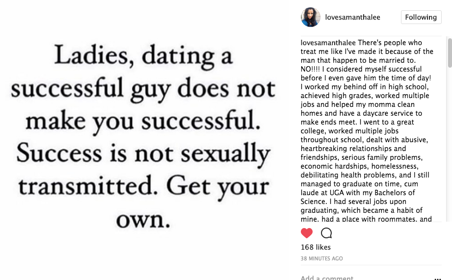 There’s people who treat me like I’ve made it because of the man that happen to be married to. NO!!!! I considered myself successful before I even gave him the time of day! I worked my behind off in high school, achieved high grades, worked multiple jobs and helped my momma clean homes and have a daycare service to make ends meet. I went to a great college, worked multiple jobs throughout school, dealt with abusive, heartbreaking relationships and friendships, serious family problems, economic hardships, homelessness, debilitating health problems, and I still managed to graduate on time, cum laude at UGA with my Bachelors of Science. I had several jobs upon graduating, which became a habit of mine, had a place with roommates, and did very well saving up enough money to go back to school to get my masters. Battled homeless again, exhaustion, emotional hardships Worked at some of the most difficult places in social work, and maintained a 3.98 GPA while hustling on the side as a bartender. I graduated, worked as cleaning woman, a bartender and at a DV / trafficking site while studying for my licensure upon graduating with my masters. I got my licensure and waited on God for my perfect job working within the school system. AND maintained my bartending job for some extra income.