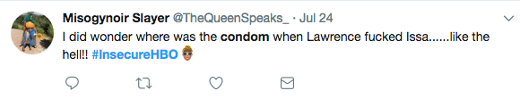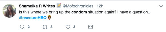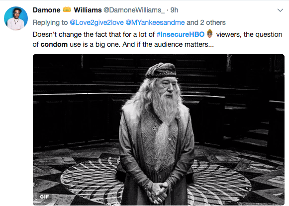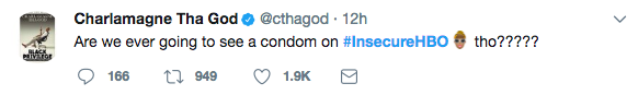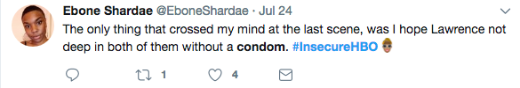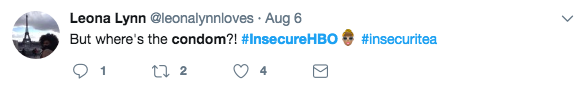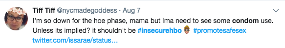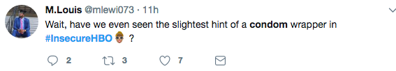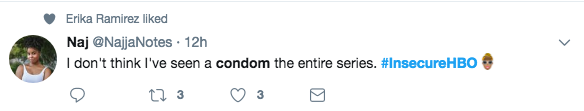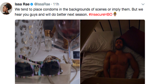We tend to place condoms in the backgrounds of scenes or imply them. But we hear you guys and will do better next season. #InsecureHBO