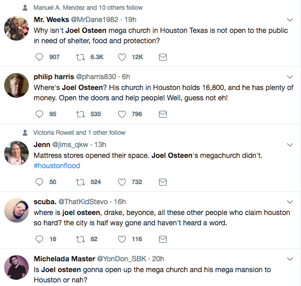 On Monday, Osteen and his Lakewood Church received backlash for remaining closed and not assisting those in need.
