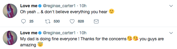 Lil Wayne’s daughter, Reginae Carter, has taken to social media, addressing reports that her father has been hospitalized. She writes,