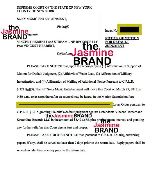 theJasmineBRAND.com broke the story back in March, Sony filed a motion for default judgement explaining Herbert was served with the legal docs and has failed to respond to the allegations in court. They are seeking the full $3.4 mill + interest.