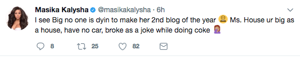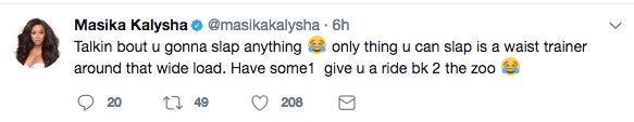 Masika needs STFU!!! she’s disgusting, who gave her the right to tell people she open doors for them, she needs to take several seats with macaroni shape body and wide mouth, someone should tell Hoesika it’s not about her.