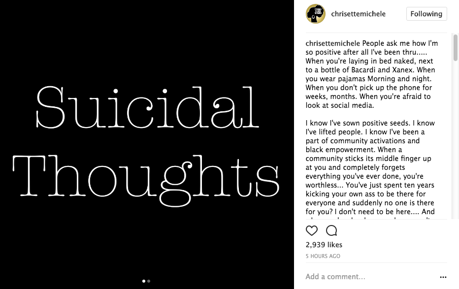 It’s been a heart-breaking time for Chrisette Michele. The soulful singer recently revealed on social media that she suffered a miscarriage, was dropped from her label and had suicidal thoughts. She spoke transparently about each individual challenge, with the hopes of inspiring her fans that they too can face some of life’s challenges. She writes about Suicidal Thoughts,