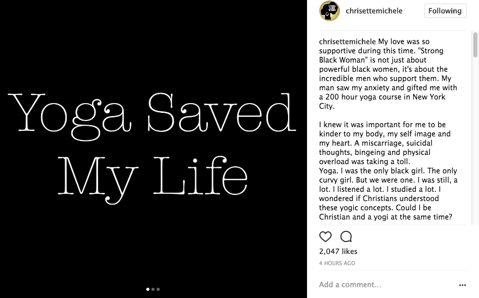 Thankfully, Chrisette says that yoga, coupled with a strong support system, helped her to overcome the challenges that she was facing. She writes,