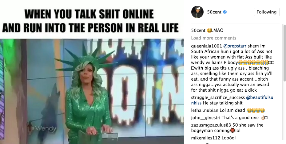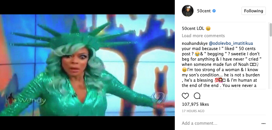 50 responded to Wendy’s comments, taking shots at both her physical appearance and the controversy that recently surrounded her and husband, Kevin Hunter. Check it out below.