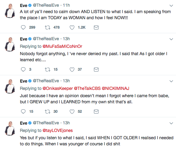 I feel with age comes wisdom. Eve has never denied who she was or done in the past, but just speaking on the Eve that is now. Nikki has to sell albums/units & will do whatever it takes. And im sure part if it, was to distract from her brother that is in jail.