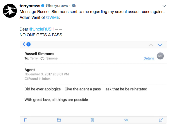 Terry Crews alleges that Russell Simmons asked him to give Hollywood executive Adam Venit a ‘pass’.