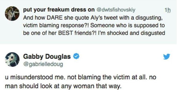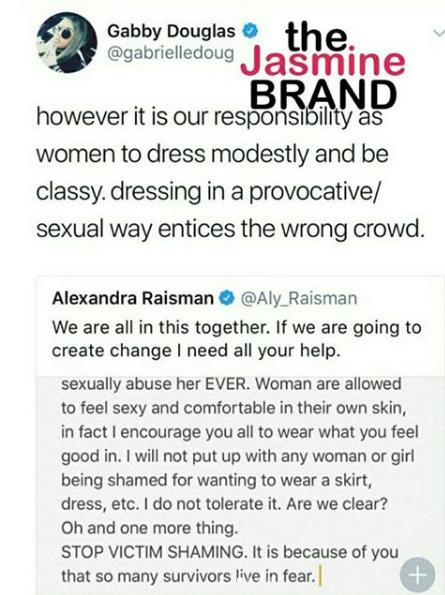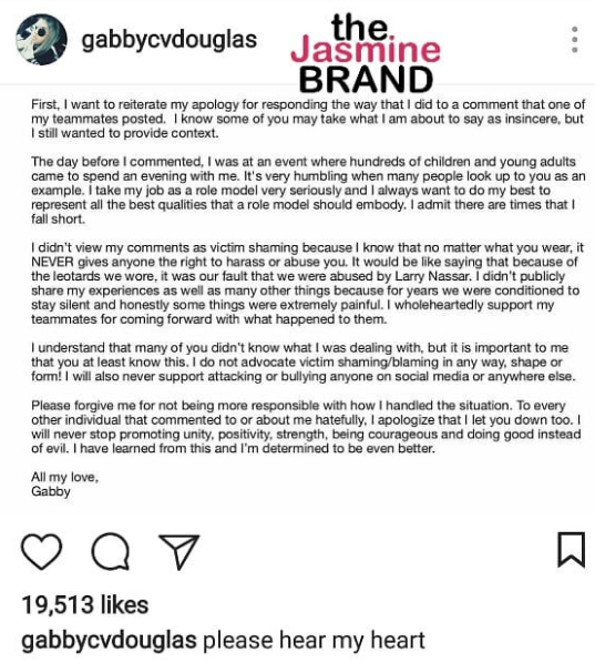 In Douglas’ statement, she also apologizes to those who felt that she was victim shaming, in response to her teammate Raisman’s twitter comment. See below for the controversy her comments sparked last week.