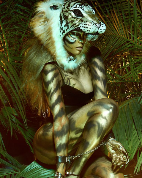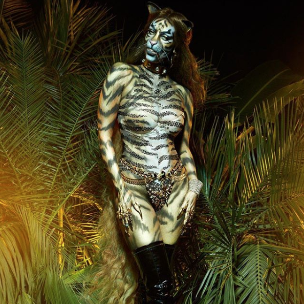 The shoot included a stunning transformation which required a five-foot wig, a tiger mask made from hundreds of sequins, five sets of fake nails and three sets of prosthetics. Check out the shoot!