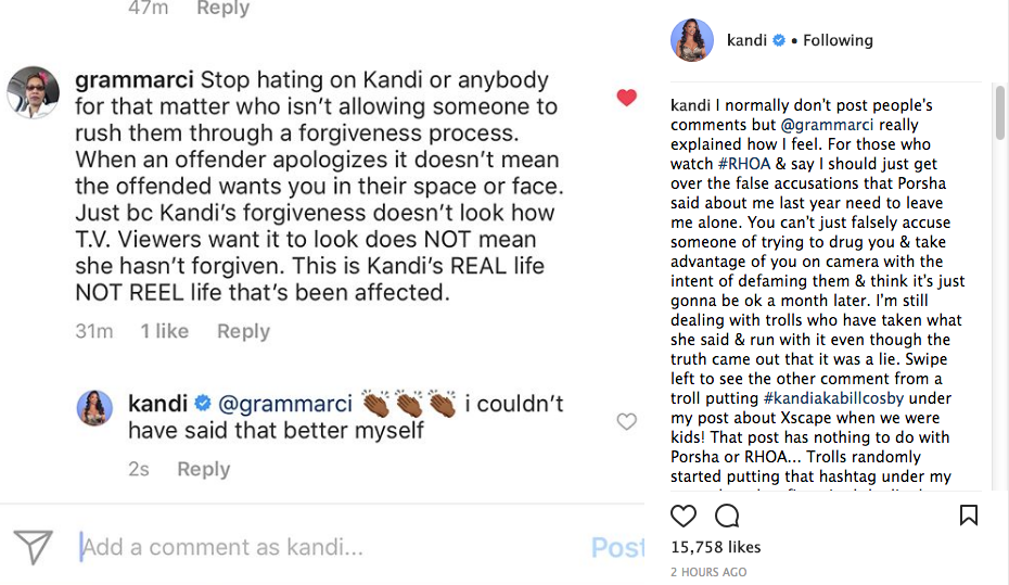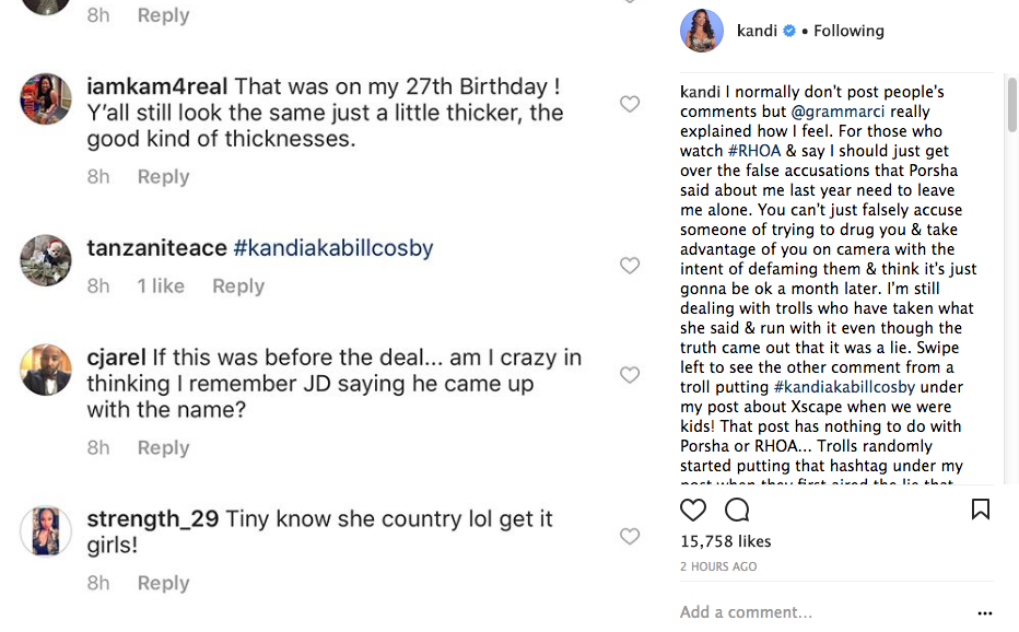 I normally don’t post people’s comments but @grammarci really explained how I feel. For those who watch #RHOA & say I should just get over the false accusations that Porsha said about me last year need to leave me alone. You can’t just falsely accuse someone of trying to drug you & take advantage of you on camera with the intent of defaming them & think it’s just gonna be ok a month later. I’m still dealing with trolls who have taken what she said & run with it even though the truth came out that it was a lie. Swipe left to see the other comment from a troll putting #kandiakabillcosby under my post about Xscape when we were kids! That post has nothing to do with Porsha or RHOA… Trolls randomly started putting that hashtag under my post when they first aired the lie that Porsha said. I normally try to block delete the comment but I figure maybe some of you need to see it. This is my REAL life not my REEL life like @grammarci said. If the truth wouldn’t have came out some of y’all would’ve been putting me in the box with some of those predators that are being put on blast right now. All because her ass was spreading lies about me on national tv. So stop putting a timeline on when I’m suppose to forgive & forget….