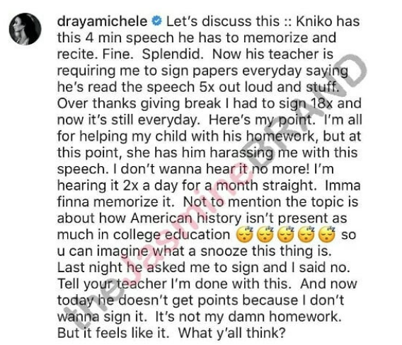 Draya Michele is being criticized for complaining about the amount of homework that her eldest son has. The former Basketball Wives LA star posted a message on social media, explaining how she felt her son Kniko’s teacher relied too heavily on a parent’s participation.