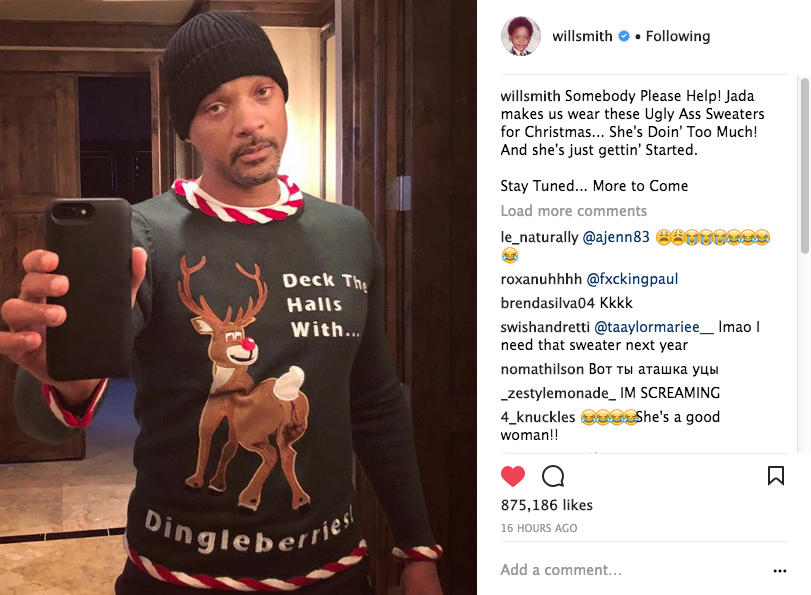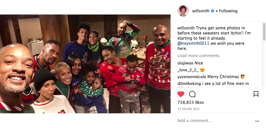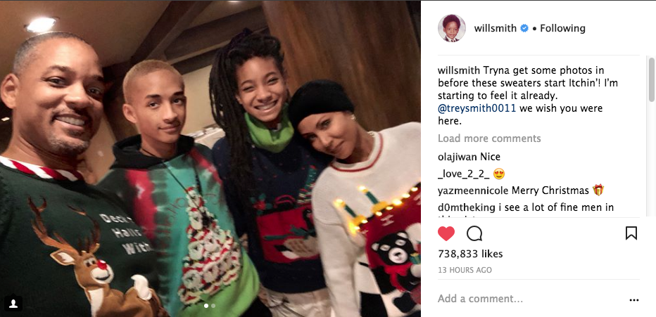 Will, who recently joined Instagram, jokingly posted a selfie of his ugly sweater, along with group family photos of their holiday.