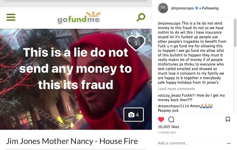 Jim Jones says someone is trying to scam some of his fans. 24 hours after the rapper’s mother’s home (Nancy Jones) caught fire, Jones says a fake Go Fund Me account was created asking for money. Jones posted a screen shot of the fraudulent account writing on social media,