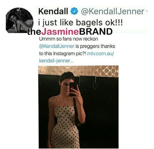 Kendall Jenner wants to make one thing crystal clear – she is NOT pregnant. This week, the reality star and model responded to a story on Twitter, speculating as to whether her bulging belly was a result of her being pregnant. Quickly shutting the speculation down, Kendall noted that she just loves bagels.