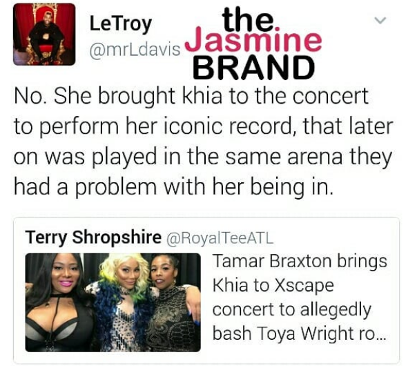 There was much speculation that Tamar wanted to bring Khia and TS on stage, because they had previously trashed Toya Wright, whom Tamar had public disagreements with in the past.