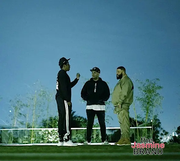 Later in the evening, he was spotted (see below) chatting it up at his home outside with DJ Khaled and Roc Nation executive Lenny Santiago.