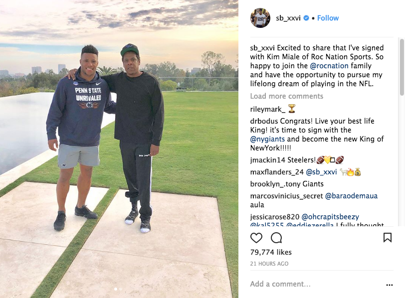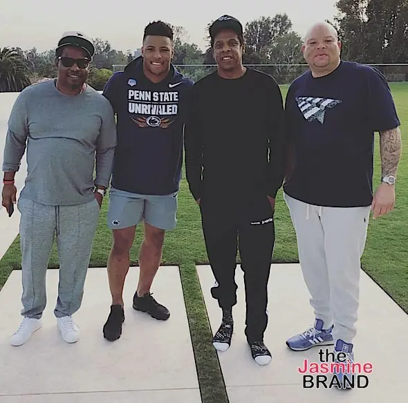 This week, the 49-year-old rapper turned mogul’s company signed college football star Saquon Barkley. The future NFL’er shared a photo w/ a shoeless Jay-Z, captioning the photo: