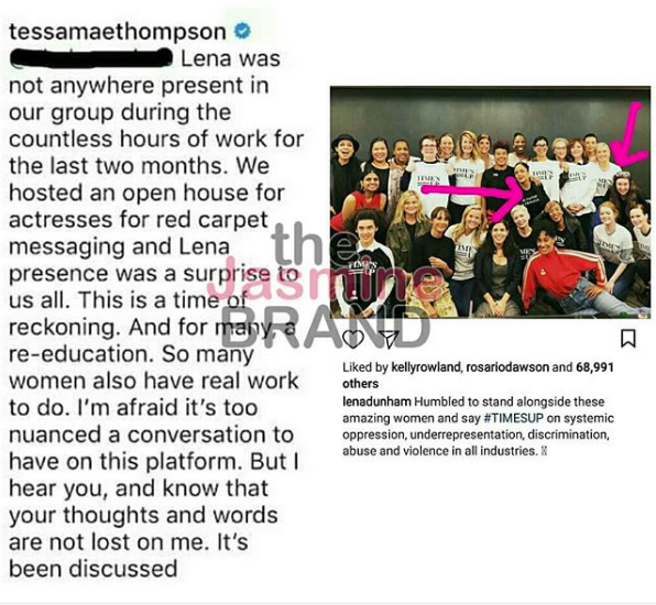 Tessa Thompson is calling out Lena Dunham, implying that the Girls actress used a ground breaking movement for a photo-op. On Sunday (January 7th), Thompson posted a photo featuring several actresses, including 31-year-old Dunham. In the photo, she pledged support for the ‘Times Up’ movement, which helps provide legal aid for victims of sexual assault, harassment and inequality in the workplace.