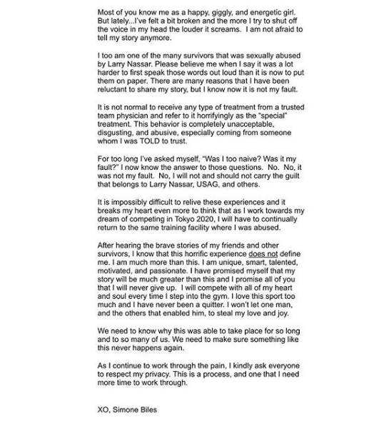 Simone Biles: I was molested by my gymnastics doctor Larry Nassar.