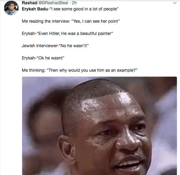 Love her, but she gets in trouble so often, I mean seeing good in Hitler?? girl whaat?? wonder how her man Carl handles this kind of situations that she gets herself into, this in him http://wagcenter.com/entertainment-wags/carl-jones-5-facts-erykah-badus-boyfriend/