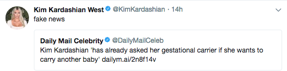 UPDATE: Kim denies this report, referring to it as ‘fake news’. See her tweet below.