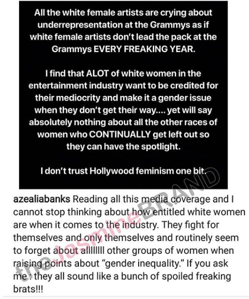 Azealia Banks has a message for white women complaining about under representation at the Grammys and in Hollywood. She writes,