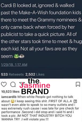 Cardi B is responding to reports that she ignored Make-A-Wish Foundation kids, while on the red carpet at the Grammy’s. The rapper took to social media, addressing a post that claimed that she only stopped to pose for a quick photo with the kids, after being forced to by her publicist.