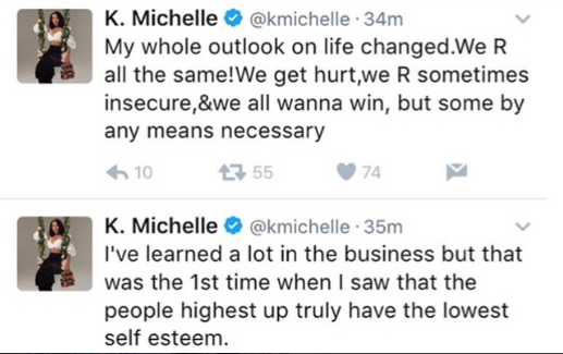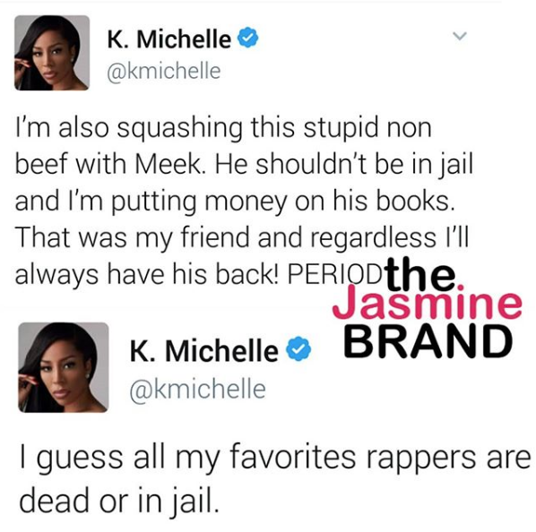 The non-beef issue that K.Michelle is referring to seems to be about a dispute over a record that involved her, Meek and his ex girlfriend Nicki Minaj. Reportedly, while working on her 2014 album Anybody Wanna Buy a Heart?, she was allegedly told that she would have to take a song off of her album. K. Michelle alluded to Meek’s then girlfriend (Minaj) thinking that she and Meek were having sex and because of this, the song was pulled. K.Michelle tweeted about this last year. See her tweets, which she later deleted, below.