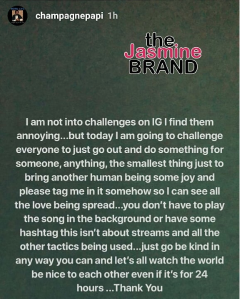 Drake doesn’t like social media challenges. In fact he thinks they’re ‘annoying’, but he has one for his fans. Moments after releasing his “God’s Plan” video, he asked fans to do one thing to help another human being. His request is inspired by the theme of “God’s Plan”, a video full of Drizzy doing all sorts of good deeds, which totaled almost $1 million. See Drake’s request below, along with his latest video.