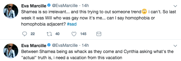 Living your truth is not telling your business to whoever wants to know. And Eva letting them know Will has an alleged girlfriend is not the same as Shamea questioning Eva’s sexuality. I would hope “a friend” would not keep me in the dark.