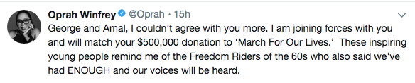 George and Amal, I couldn’t agree with you more. I am joining forces with you and will match your $500,000 donation to ‘March For Our Lives.’ These inspiring young people remind me of the Freedom Riders of the 60s who also said we’ve had ENOUGH and our voices will be heard.