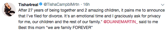 It appears that Tisha Campbell and Duane Martin’s split will be amicable. After news hit that the couple were divorcing after 27 years, Tisha hopped on social media releasing a statement. She tweeted,