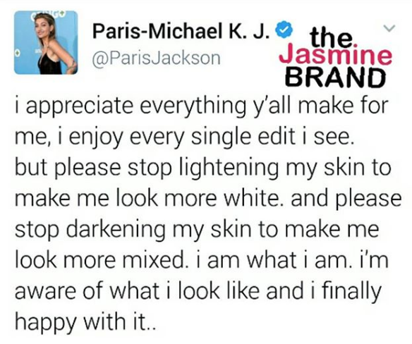 Paris Jackson (19) has one small request, please stop lightening her image in photos. The famous daughter of the late singer Michael Jackson wrote on social media,
