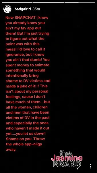 Rihanna is slamming Snapchat. Today (March 15th), the singer posted a lengthy social media message criticizing the social media app for what she feels was an advertisement poking fun of domestic violence. She writes,