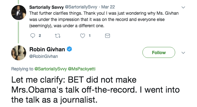 Despite the conversation being labeled ‘sacred’, BET posted sections of the Obama interview on its website. A BET rep responded to the controversy stating that Givhan was “invited as a guest (not working press) to moderate a fashion panel,” and her travel and hotel were paid for by BET.