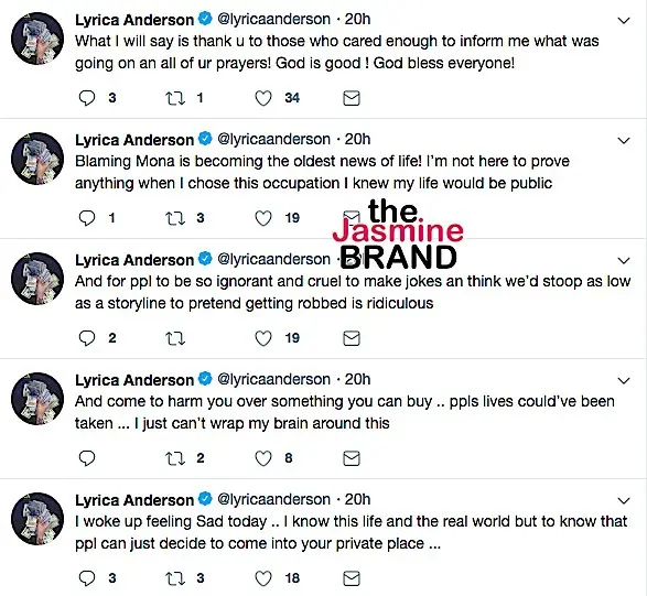 Lyrica Anderson says that she and her husband did NOT fake a robbery to create a storyline for Love & Hip Hop: Hollywood. She also notes that the show’s executive producer, Mona Scott-Young, should not be receiving backlash. See her tweets.