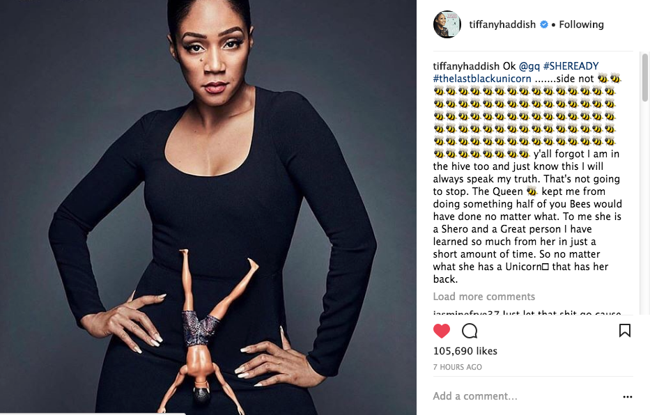 Ok @gq #SHEREADY #thelastblackunicorn …….side not [sic] y’all forgot I am in the hive too and just know this I will always speak my truth. That’s not going to stop. The Queen ? kept me from doing something half of you Bees would have done no matter what. To me she is a Shero and a Great person I have learned so much from her in just a short amount of time. So no matter what she has a Unicorn? that has her back.