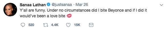 It has been alleged that Sanaa Lathan was the person that bit Beyonce. Sources claim that she did so (allegedly), in playful manner. Sanaa disputed this on social media.