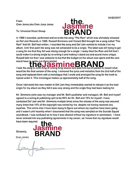 The song in its original incarnation was written by Vincent Bell but later given to Jones, who re-wrote the lyrics. The split was supposed to be 85% going to Bell and 15% going to Jones, but as Jones says in the letter below, it wasn’t until the song was sampled for the “Suicide Squad” soundtrack without his permission that he learned of his omission from the songs publishing royalties. Since the album came out on Atlantic Records, that would technically owe Jones for monies earned by the use of the “The Rain” sample.