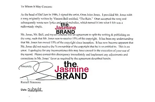 The 60-year-old was accused of sexual assault by six separate women in recent months and now in a notarized letter obtained exclusively by us, Simmons acknowledged that his former artist Oran “Juice” Jones is owed 15% of the publishing for his 1986 hit single “The Rain.” See the docs.