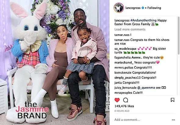 Congratulations to the Gross family! Lance and his wife, Rebecca, are expecting their second child together. On Easter, Lance posted an Easter family photo, with Rebecca holding her budding baby bump and daughter Berkeley making a silly face. The actor captioned the photo: