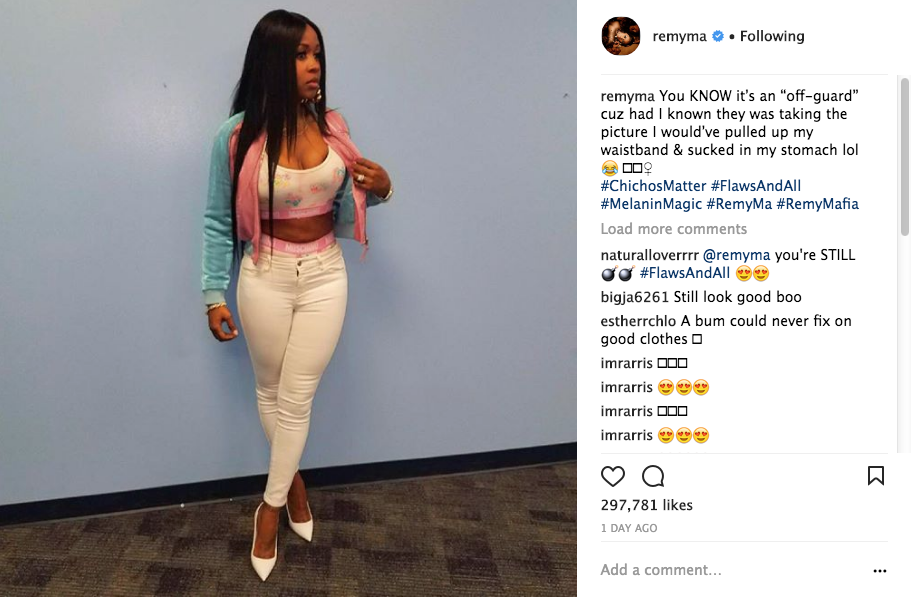 Remy Ma is slim thick these days and she’s giving her fans the secret to her new shape. This week, the Love & Hip Hop New York star posted a photo of her wearing skinny jeans, a mid drift top that showed off her stomach, a jacket and nude heels.