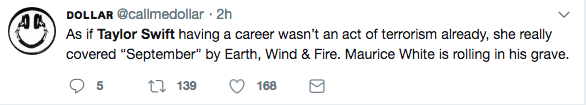 Taylor Swift is being slammed for a recent cover. On Friday, the pop star released a version of Earth, Wind & Fire’s hit song “September.” The cover was done in honor of the famous ’70s band, who presented her with a Grammy Award in 2016. Listen to a snippet of her cover below.