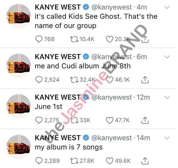 West confirmed a seven track solo release will drop on June 1st. He also revealed an upcoming joint project with Kid Cudi. He tweeted,