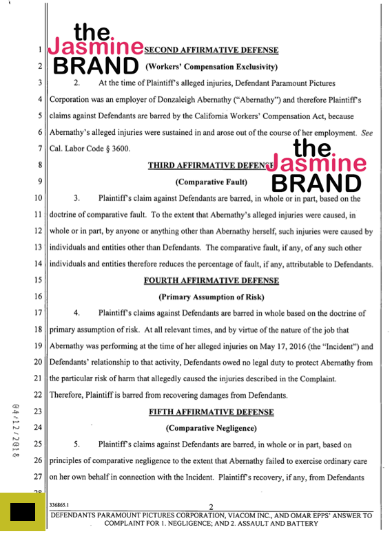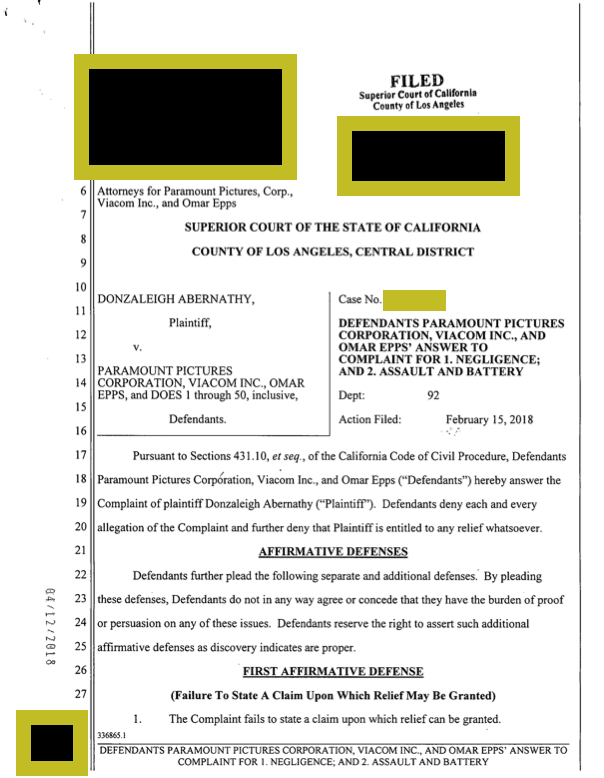 Here’s the latest: On April 11, Epps and Paramount Pictures filed docs responding to the suit. Epps argues Paramount was Abernathy’s employer and any alleged injuries should be paid out by worker’s compensation.