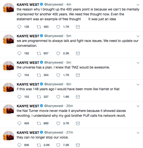 See Kanye’s tweets below, concerning his slavery statements.