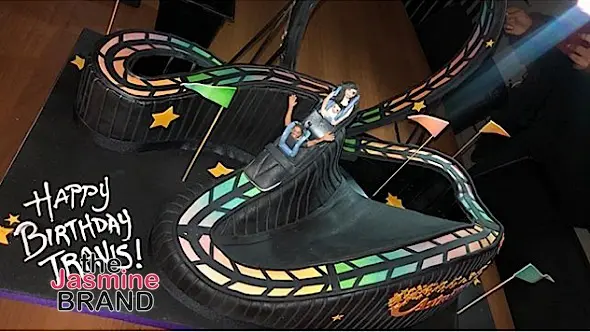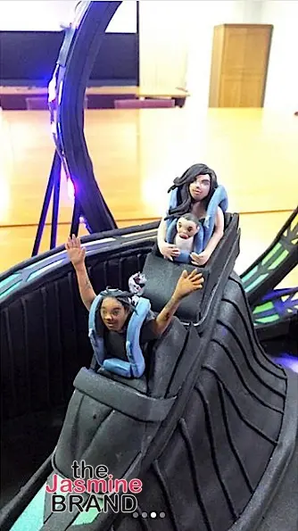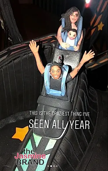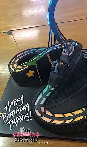 Astroworld signs were scattered across the park, and Jenner even managed to tie the childhood memory into Scott’s birthday cake. One social media post the Kylie Cosmetics founder shared showed a picture of the massive, black roller coaster cake she had created for Scott.