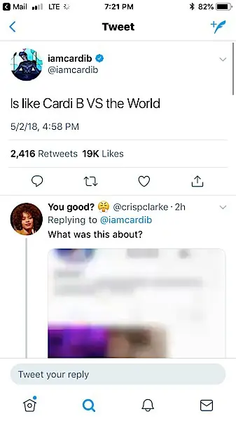 Cardi B removed Kash Doll’s “She Bad” verse and is now blocking her from posting it. pic.twitter.com/xAD8fgTVrm