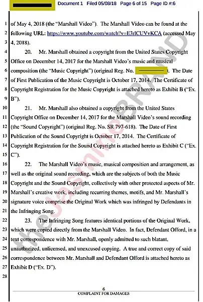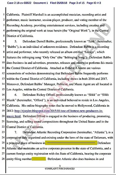 In the docs, Marshall says Tank nor any other parties sought permission to use his work nor has he been paid. Marshall is suing for an injunction against Tank from being able to continue to distribute and profit off the alleged infringing song, $150k in damages per infringement and attorney fees.